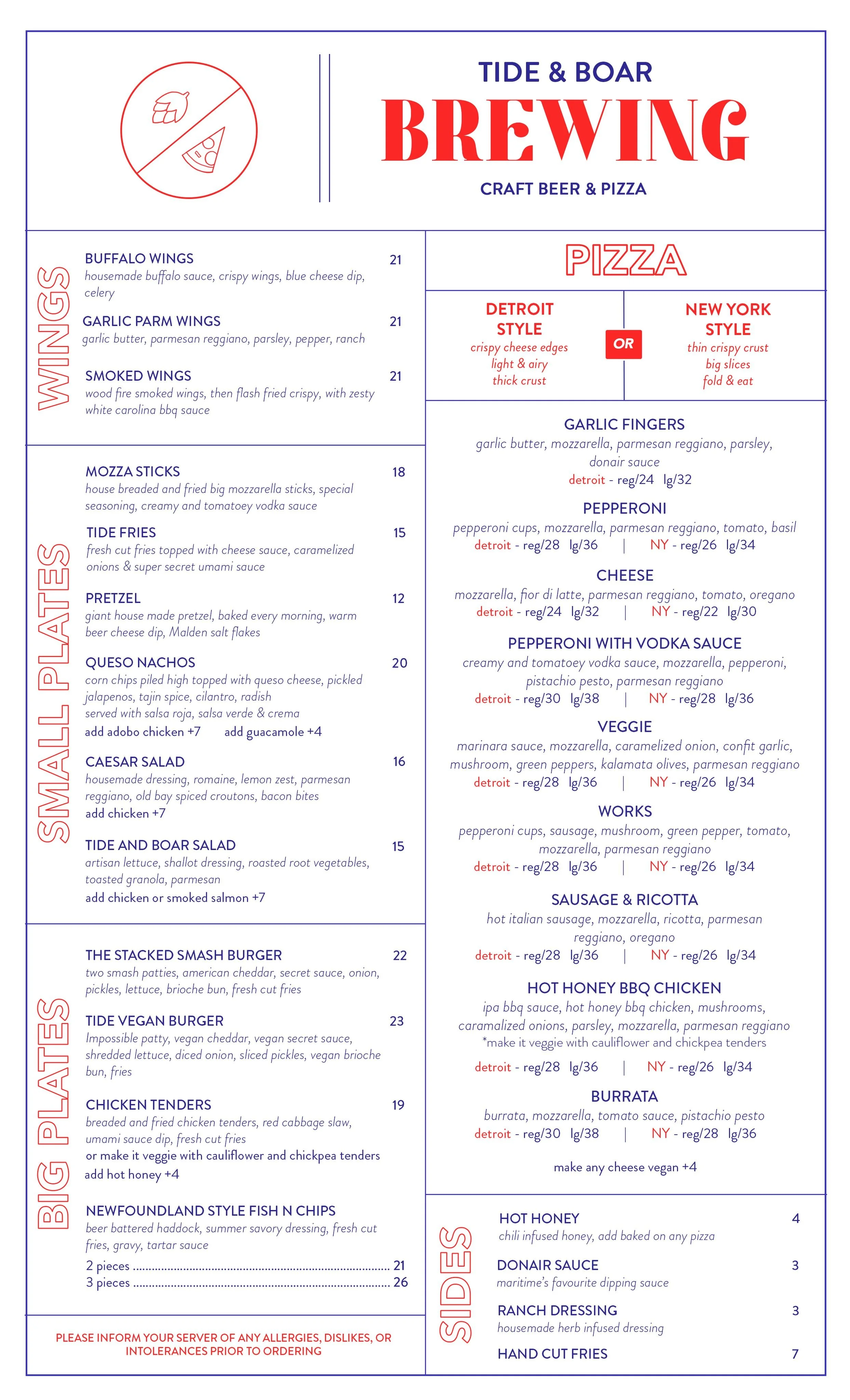 Our menu was built with one idea in mind: food made for beer. At the heart of it is pizza, Detroit and New York–style. We import many of our ingredients, so you’ll be biting into the same pepperoni found at some of New York’s top pizzerias, and even the same cheese. Our crust is a three-day sourdough process, and our sauce is made with organic tomatoes. We care about the details, because like you, we want the best food to go with the best beer.